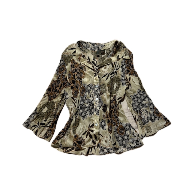 Vintage-Style Floral Print Pleated Blouse with Flare Sleeves ヴィンテージ風 フローラルプリント プリーツ ブラウス フレアスリーブ