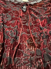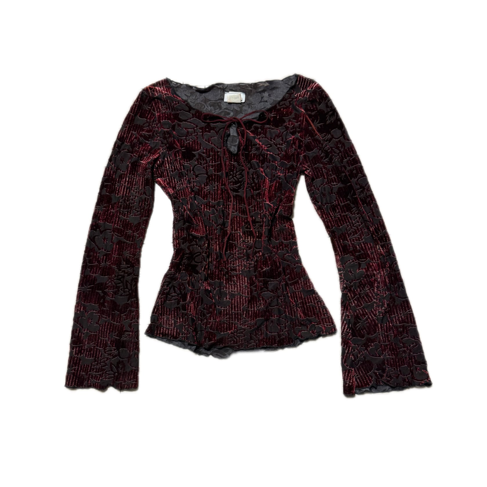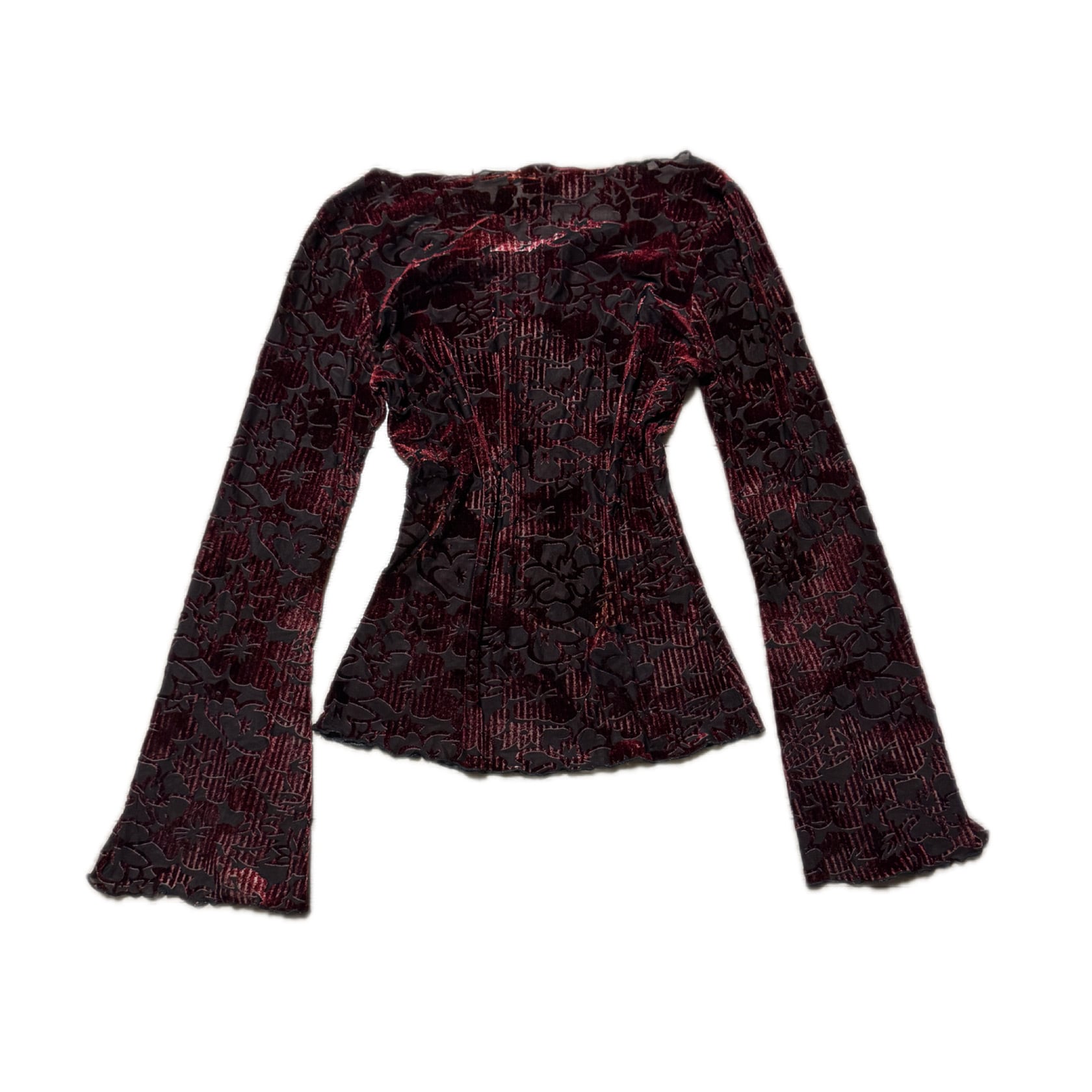 00s Y2K Burgundy Floral Burnout Velvet Bell Sleeve Topバーガンディ 花柄シアーベロア ベルスリーブトップス
