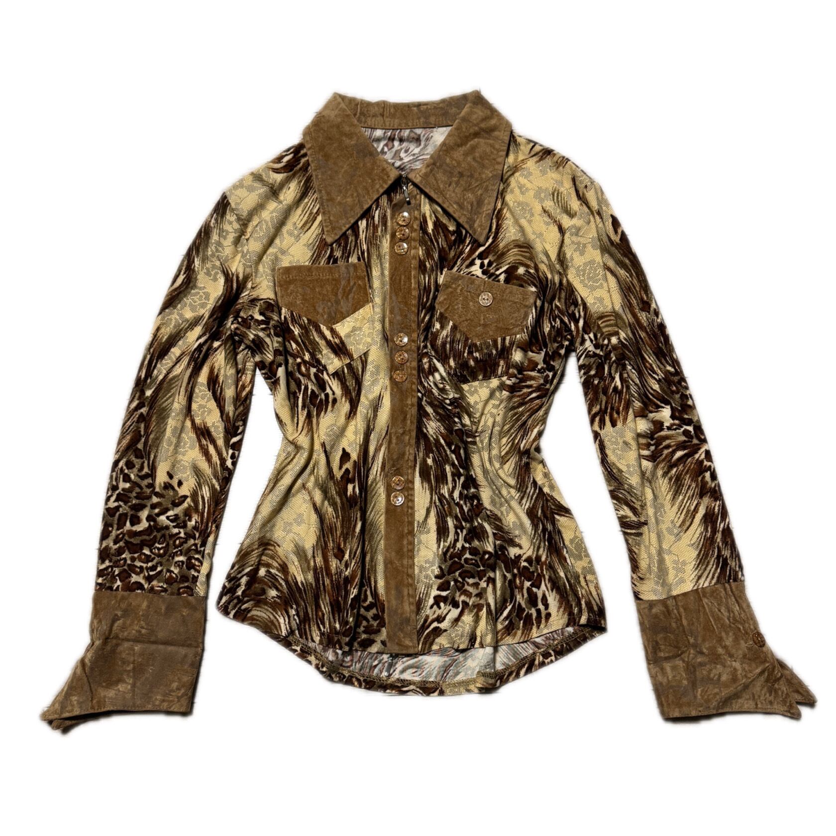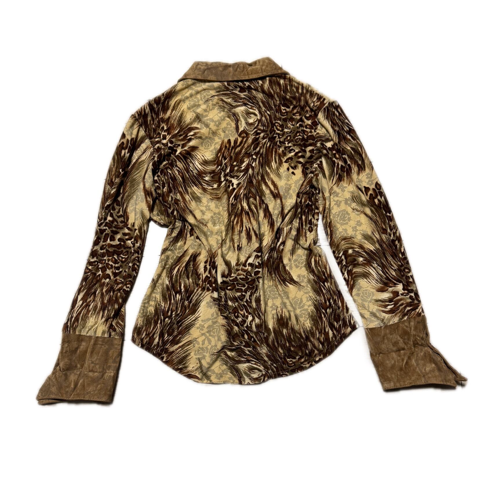 Vintage 2000s Gal Core Leopard Feather Pattern Button Up Y2K アニマルミックス ウエスタンシャツ スエード切替