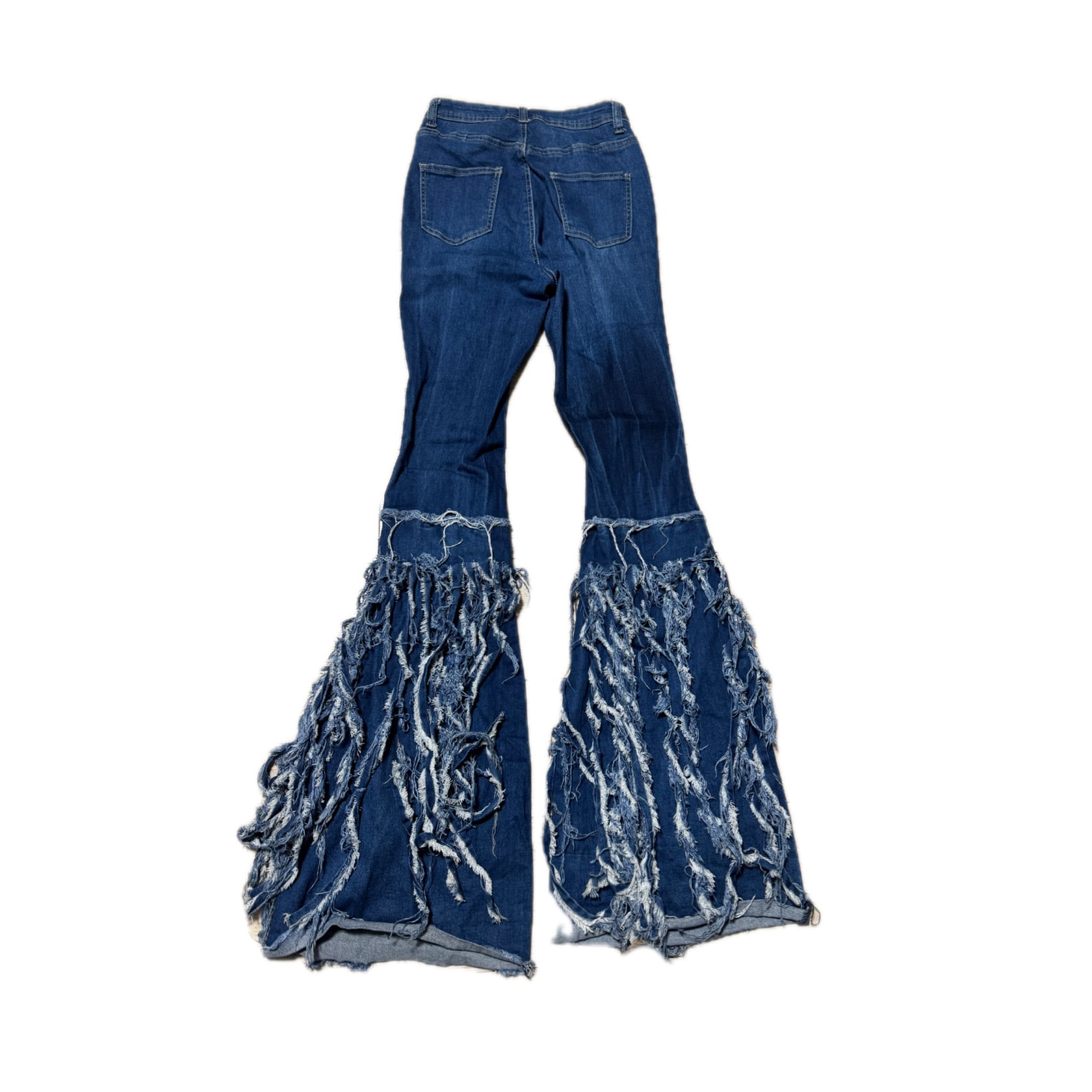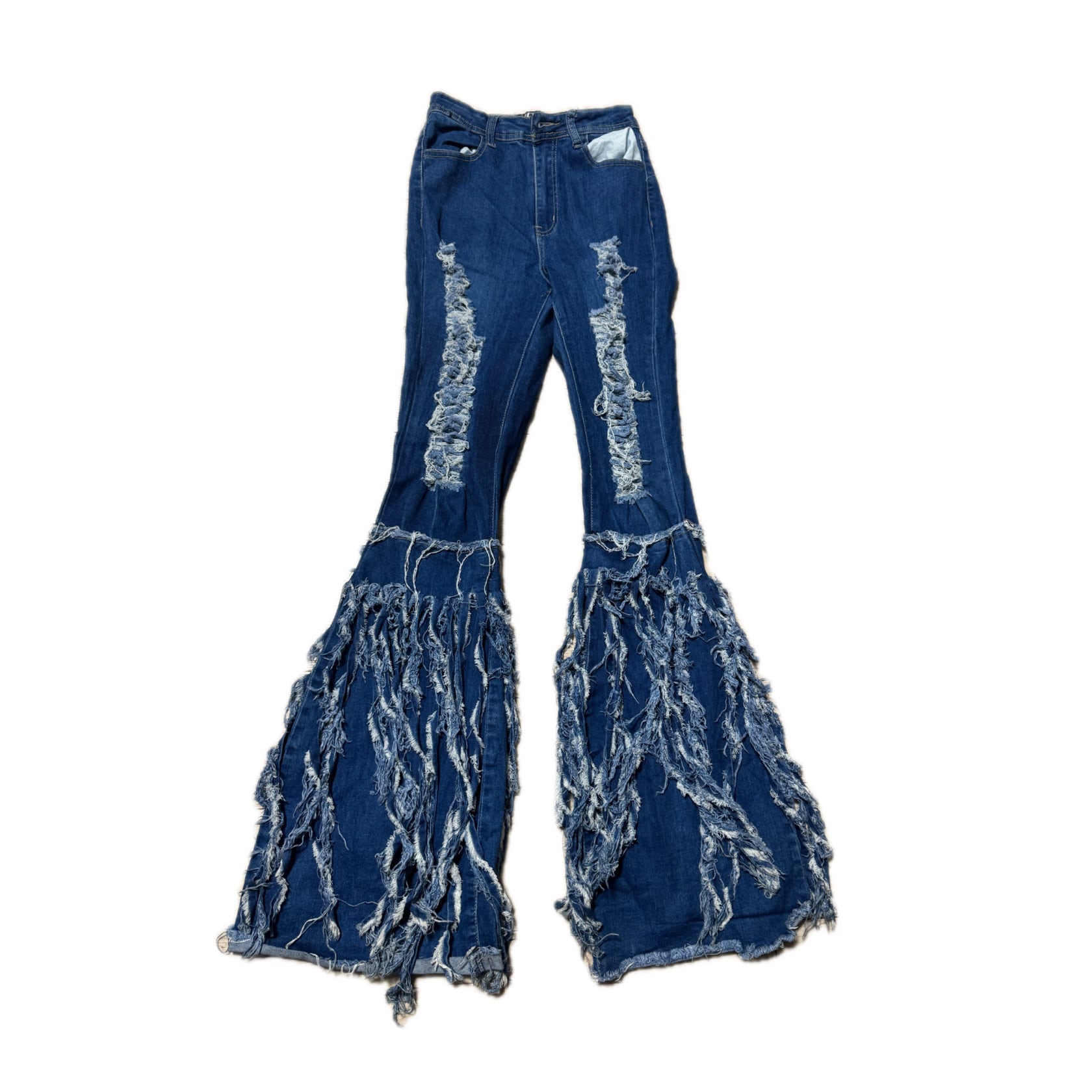 Super flared distressed denim with heavy fringe detailing / スーパーフレア ダメージフリンジ デニムパンツ