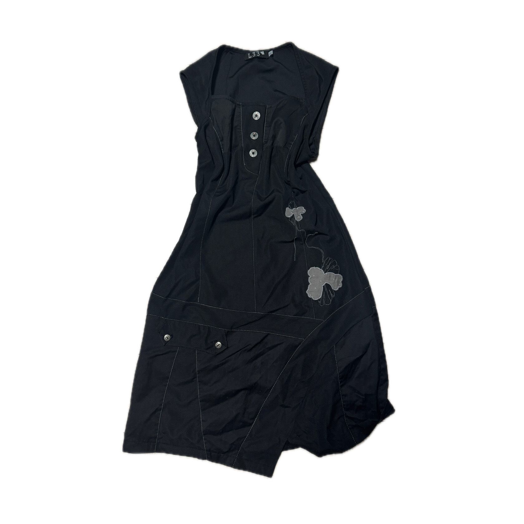 Black Cap Sleeve Utility Dress with Floral Embroidery ブラック キャップスリーブ ユーティリティドレス 花柄刺繍